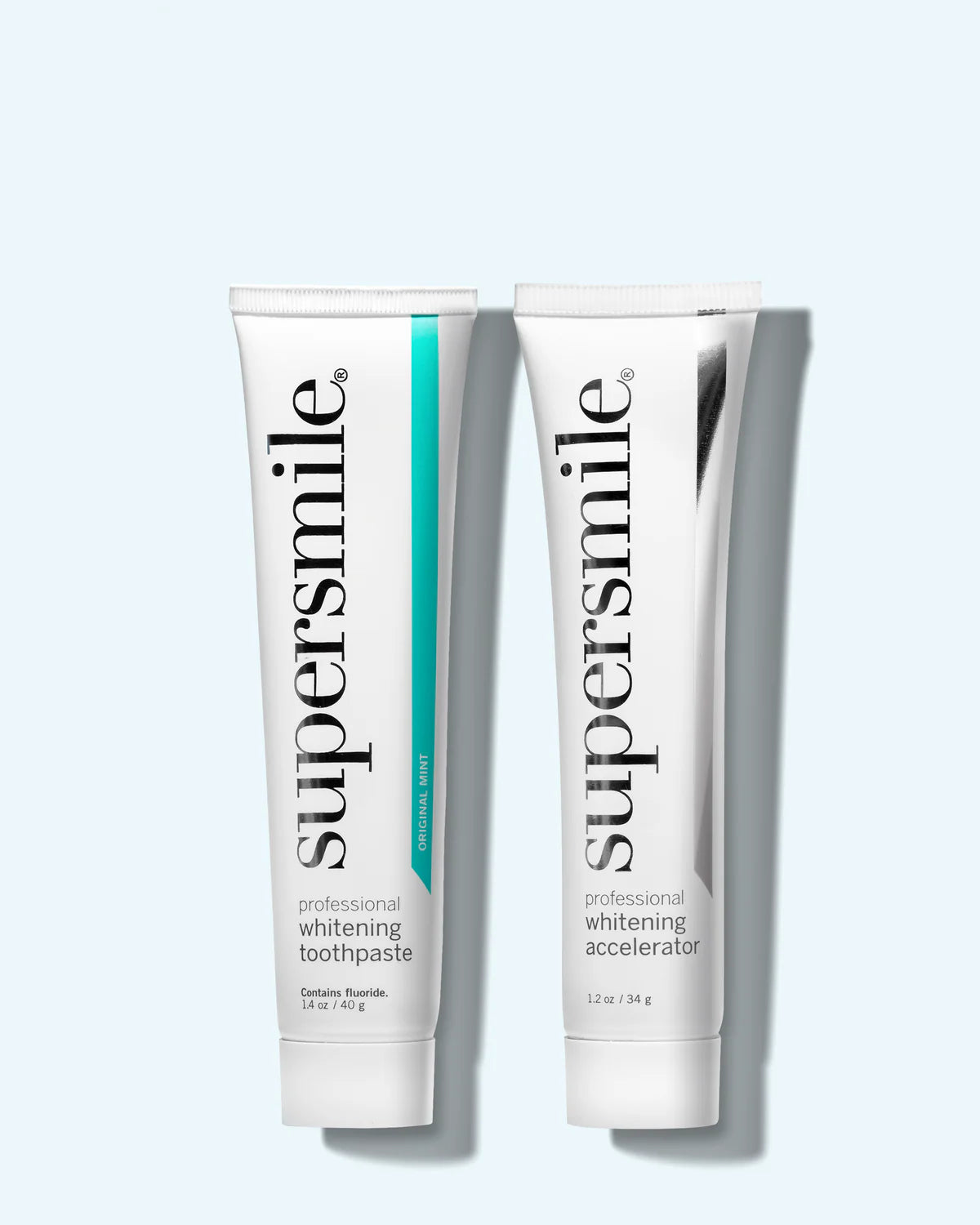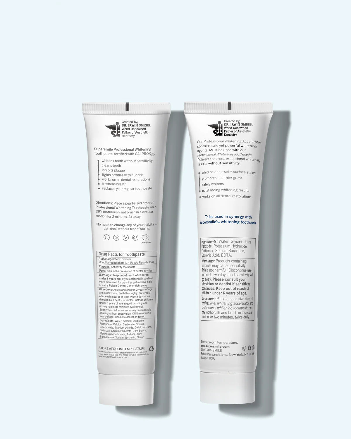 This two-step system includes our Fluoride Professional Whitening Toothpaste and Whitening Accelerator, designed to work in tandem to gently lift surface stains and polish teeth without sensitivity or harsh abrasives. Safe for daily use on natural teeth, veneers, caps, and bonding
