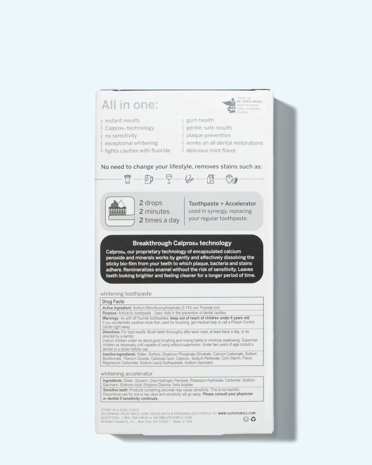 Teeth look 2 shades whiter the first time you use this system on a dry brush. Used together, professional whitening toothpaste and professional whitening accelerator combine Calprox®, our proprietary formula of encapsulated calcium peroxide and minerals, to gently clean and whiten your teeth. Expect the ultimate teeth whitening results, without any harsh abrasives. Formulated with clean ingredients for safe teeth whitening without sensitivity or a chance of over-bleaching